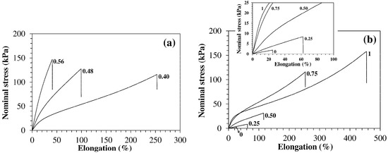 According to the rubber elasticity statistical theory, the initial modulus of unfilled elastomeric networks increases proportionally to νchem [33]. Conversely, the stretch ratio at break λb = lb/l0 (lb and l0 are the length of the gauge at break and in the undeformed state) is expected to decrease proportionally to νchem−1/2 [44]. Thus, this theory predicts that, if the only parameter changed is νchem, an increment in mechanical stiffness can only occur at the expenses of a reduction in extensibility. The results of Figure 11a and Table 4 are in qualitative agreement with these predictions. A different trend is observed when the network HLB is changed while keeping constant fJD400 and, therefore, νchem (Figure 11b).