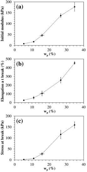 Figure 12 shows the dependence of tensile properties from the polymer weight fraction. At low values of wp the properties increase rather slowly, but their increment becomes more pronounced when wp ≳ 10%.