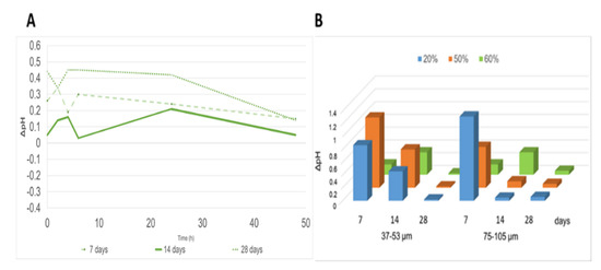 ∆pH with GP reported: (A) vs. time for GP/WG 60% (37–53 µm) aged 7, 14, and 28 days and (B) for both series as a function of curing time and WG percentage.