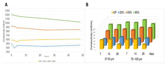 The values of pH (Figure 1) and ionic conductivity (Figure 2) over a period of 48 h in stirring water and with a solid/liquid ratio 1:10 were performed in order to evaluate ion release from part of all the geopolymers, as shows as an example the trend of the pH, calculated as the pH of GP/WG 60% subtracted by the pH value of GP, after 7, 14, and 28 days. Note that at 48h the difference between GP/WG and GP is about 0, thus confirming a stabilization of the pH of the WG added MK-based geopolymers. pH trend shows an initial jump, as observed in previous work [39]. All the tested formulations present similar behaviors. In Figure 1B it the pH trend between the two different grain size is very similar, confirming that after 28 days the pH of the GP/WG at various %, and particle sizes are almost identical to that of the GP based only on MK. The finer WG reacts faster, showing a ΔpH close to zero after a curing time positioned between 14 and 28 days.