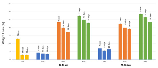 Values of weight loss after the integrity tests for samples GP and GP/WG from 37–53 µm and 75–105 µm series.