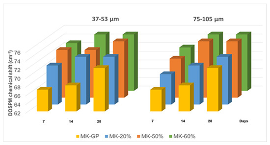 Particular attention has been posed on the role of the WG in its finer grain size range, 35 μm < dWG < 57 μm, where the interaction with the alkaline solution is more intimate with respect to coarse grains. The reactivity of fine WG powders within the geopolymer gel has been carefully examined and proved via FT-IR (Figure 4) specially with the bands between 1008 and 1005 cm−1 ascribed to Si–O–Si and Si–O–Al asymmetric stretching vibrations. These bands, also known as DOSPM (Density of States Peak Maximum), are often used to determine the geopolymerization degree [49]. The DOSPM shift of GP and GP/WG (20, 50 and 60%) in respect to MK DOSPM (that appears at 1080 cm−1) is reported in Figure 9 and gives an indication of MK dissolution and polycondensation reaction which lead to the formation of specific geopolymer network [41]. Moreover, the lack of DOSPM sharp features (Figure 9) is also indicative of the general disorder in the Si(Al)-O-network, reflecting the wide distribution of SiQn(mAl) units either in the geopolymer or in WG/MK. SiQn(mAl) is used to describe the structural units in aluminosilicates, in which, generally, the absorption bands of the SiQn unit with n = 4,3,2,1,0 are centered at around 1200, 1100, 950, 900, and 850 cm−1, respectively. The shifts to lower wavenumbers occurred when the degree of silicon substitution by aluminum in the second coordination sphere increases, as consequence of the weaker Al–O bond [49].