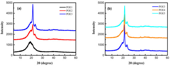 The structural change among POE samples were recorded by X-Ray Polycrystalline Diffractometer (D8 Advance, Karlsruhe, Germany) with Cu radiation at room temperature. The diffraction scans were collected in the range of values from 4 to 60 degrees, controlling a sampling rate of 1 Hz.
