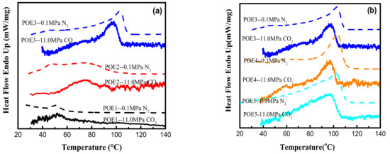 DSC (NETZSCH DSC 204PH, Selb, Germany) equipped with high pressure attachment was employed to measure the melting and crystallization behaviors of POE samples in atmospheric N2 pressure and 11 MPa CO2. Firstly, gas replacement and pressurization were performed, and samples were saturated for 1 h, then all samples were heated to 150 °C at first and then cooled to 30 °C with the rate of 10 °C/min. The melting temperature (Tm) and crystallization temperature (Tc) were determined.