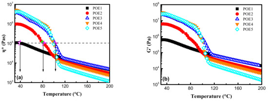 Temperature dependence of (a) complex viscosity, ; (b) storage modulus, ; (c) loss modulus, ; (d) loss angle, tan for POE samples during the temperature-rising sweep process.