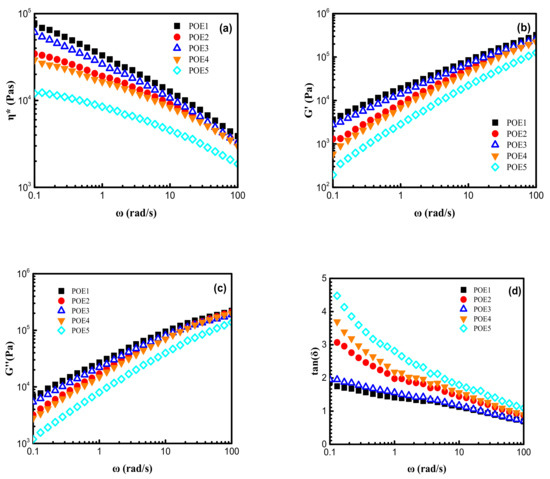 Shear rheological behaviors of POE samples measured at 120 °C in the frequency range between 100 and 0.1 rad/s: (a) complex viscosity, ; (b) storage modulus, ; (c) loss modulus, ; (d) loss angle, tan .