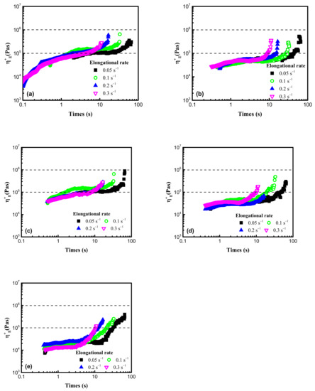 Elongational viscosities for 5 POE samples, at temperature of 150 °C. (a) POE1; (b) POE2; (c) POE3; (d) POE4; (e) POE5.