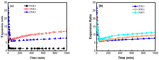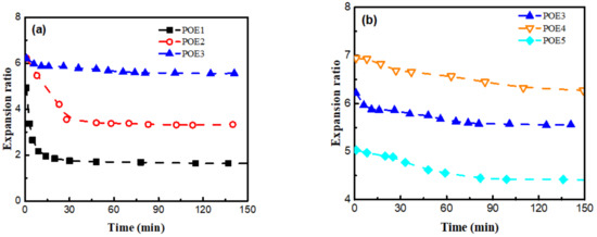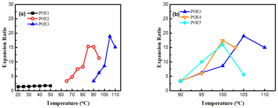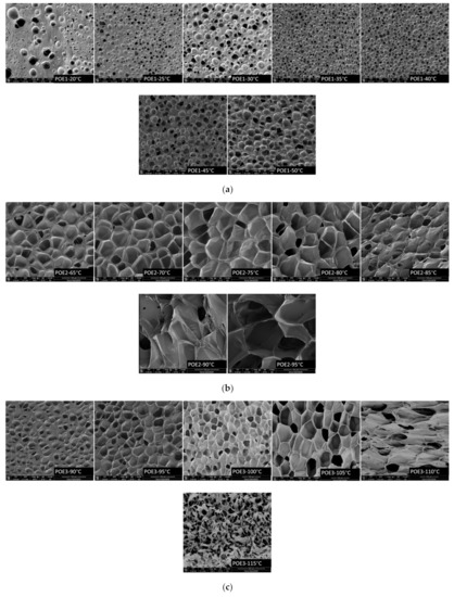Figure 9 was SEM images and Figure 10 summarized the expansion ratio of different POE foams, which were totally stabilized at the aging time of 21 days. As mentioned above, the foaming temperature window of different POEs was close to their POE melting range. Figure 10a shows that the foaming window shifts to the lower temperature range with the increase of octene content. POE foams with lower octene content have a higher expansion ratio, which can be up to 18.9 times. Figure 10b shows that the increase of POE molecular weight can widen the foaming temperature window and increase the expansion ratio.