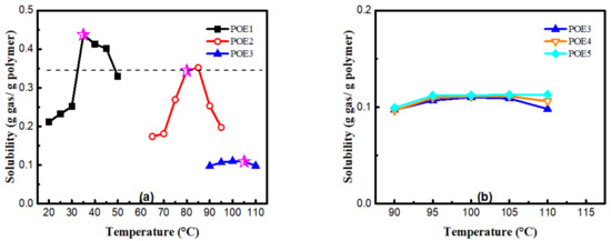DSC test results were shown in Table 3, Figure 3 and Figure 4. The decrease in octene content or increase in molecular weight would lead to an increase of POE crystallinity. The dissolved CO2 causes POE to be swollen and leads to an increase in free volume and chain mobility, which makes crystallization and melting temperature of POE samples shift to lower temperature values. The strong CO2 plasticization effect can significantly reduce the crystallinity of POE samples. High pressure CO2 plasticization is mainly manifested in two aspects of dissolved gas and static pressure [26]. Figure 5 summarized the solubility properties of CO2 in different POE samples at room temperature (T = 25 °C) and 11 MPa after CO2 saturated for 15 h. As expected, the increase in octene content significantly increases the solubility of CO2 in polymer, due to lower crystallinity and larger free volume. It is worth noting that although POE with higher octene content has higher CO2 solubility, the melting temperature of POE with lower octene content decreases more significantly shown in Figure 4. As the content of octene increases, the effect of static pressure becomes stronger, which reduces the free volume of the matrix and hinder the POE chain mobility.
