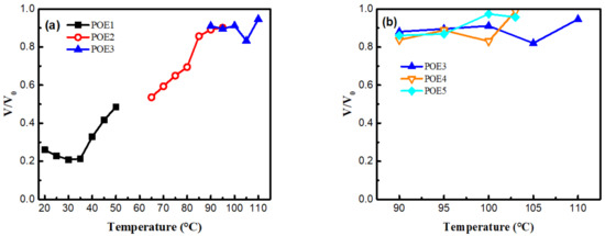 V/V0 of POE foams obtained at different temperature. V/V0 is the volume ratio after 21 days for aging and the first test at the time of 1 min (a) POE samples with same MI; (b) POE samples with same octene content.