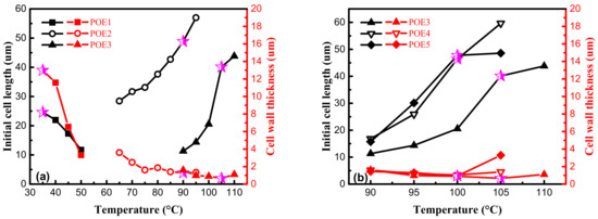 The differences in shrinkage behaviors between high expansion ratio (over 17 times) foams and low expansion ratio foams are mainly caused by the difference in cell structure. Figure 18 showed initial cell length and cell wall thickness. The cell wall parameters corresponding to the foams in Figure 16 were marked with magenta five-pointed stars. POE foams with a higher expansion ratio have a thinner cell wall thickness and a larger cell length. A shorter and thicker cell wall structure can be found for POE1 foams in Figure 18a, which causes more compression deformation of cell wall. Through the comparison of foam samples of POE3-5 with similar mechanical properties, the longer cell wall structure makes the foam shrinkage recover faster in the condition of similar cell wall thickness. It was found by SEM that the cell shape was roughly circular or hexagonal. Therefore, when the foam is compressed, the force on cell wall has two effects: axial compressive force, which causes the cell wall to undergo compression deformation, and the vertical axial force that causes the cell wall to bend. According to generalized beam theory [43], longer and thinner cell walls are easier to bend. The polymer needs to be stretched to recover to its original length after compression deformation, while the bending deformation can be recovered under ideal conditions when the pressure disappears. The shrinkage recovery behaviors of foams with thinner cell wall and longer cell length are better, because more bending deformation occurs instead of compression deformation, thereby reducing permanent deformation, due to chain slippage.