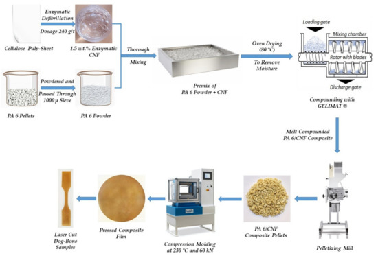 The PA 6 (density ρ = 1.14 g/cm3) was obtained commercially in pellet form from Radici Plastics Iberica SL (Barcelona, Spain). The PA 6 pellets were then powdered from Powder Plastics Europe SL (Valls, Spain) and the powdered PA 6 was passed through a 1000-micron sieve. The major particle size distribution of the powdered PA 6 ranged between 150 and 800 microns. For the rest of this paper, powdered PA 6 will be denoted as just PA 6. Cellulose was originally obtained in form of pulp sheets from Domsjö Fabriker (Örnsköldsvik, Sweden). These sheets were of high cellulose content (>97% pure cellulose) primarily derived from softwood. To prepare the CNF, an endoglucanase enzyme namely Novozyme 476 obtained from Novozymes® AS (Copenhagen, Denmark) was utilized to expedite the disintegration of cellulose pulp. The Schematic of the complete composites preparation process is depicted in Figure 2.