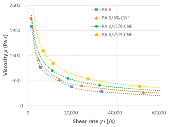 where is the true shear rate, from which the true effective viscosity μ was calculated. Thus, the rheogram representing the rheological behavior of PA 6 and PA 6/CNF nanocomposites at 230 °C was obtained.