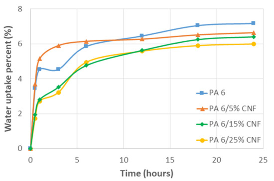 Further, water uptake study was carried out gravimetrically over a 24-h period. Mass measurements were noted periodically at 0 h, 0.5 h, 1 h, 3 h, 6 h, 12 h, 18 h and 24 h to determine the water absorption and associate it with the mechanical performance of the nanocomposite samples. In our case, two main interactions can be conjectured. The interaction between the water molecules and the amide groups of the PA 6. Then, the interaction of water molecules with the hydrophilic CNF. With the former dominating the absorption process in nanocomposite samples as the water uptake for nanocomposite samples decreased as function of CNF content but remained lower than the neat PA 6 (Figure 5). This is due to the strong hydrogen bonds between CNF and PA 6 along with the CNF–CNF interaction which are competing with water [39]. To study the influence of moisture on the mechanical properties, tensile samples were moisture conditioned for 48 h in a climatic chamber at 23 °C and relative humidity 50% prior to testing. From the Table 1, all the conditioned samples (48 h CC) showed reduced tensile modulus and strength. The reduction of modulus in the presence of moisture is common to most polyamides due to the plasticizing effect of water molecules on polyamides [40]. Tg for moisture conditioned PA 6 can decrease to room temperature and below, as water molecules interfere with hydrogen bonds between the polymer chain increasing the chain mobility. The reduced Tg causes a strong reduction of the amorphous modulus in the presence of moisture leading to decrease in the semicrystalline polymer [41]. Additionally, the reduction of modulus of matrix results in the modulus reduction of the nanocomposites. With increased mobility due to moisture conditioning, the yield stress also decreases and the deformation at break increases. Hence, moisture is a key factor affecting processing and final performance for PA 6/CNF nanocomposites.