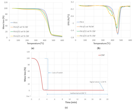 Thermograms, (a) TGA, (b) DTG for neat PA 6 and PA 6/CNF nanocomposites and (c) TGA of CNF gel at isothermal conditions at 230 °C.