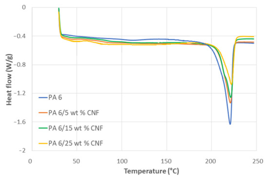 DSC analysis was conducted to recognize the effect of CNF content on the melting behavior and crystallinity of PA 6 matrix. Single, well defined endothermic peaks were obtained for all samples and the DSC thermogram for the heating cycle is shown in Figure 7. The values of glass transition temperature (Tg), melting temperature (Tm) and corresponding enthalpies (∆H) are summarized in Table 3, according to Equations (11) and (12) in the experimental section.