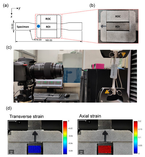 The load data was obtained from the machine readings and the strain field was measured on the surface of each specimen by a DIC system. An open-source 2D Digital Image Correlation (Ncorr v1.2, Georgia Institute of Technology, GA, USA) analysis software program was used [28]. To measure the strain with the DIC, a random pattern of small black and white speckles was sprayed on the specimens, allowing the DIC to track relative displacements. We used a camera (D5500, Nikon, Japan) with a microlens (AF-S MICRO NIKKOR 105 mm 1:2.8 G ED, Nikon, Japan) to obtain images of the test section at the center of the specimen, that is, the region of interest, ROI (Figure 1). Video footage was taken during the entire test at 25 fps at 1080p for a balance of memory storage and resolution.