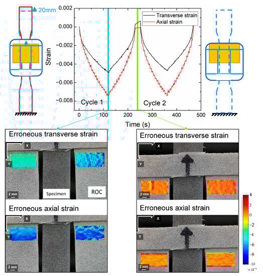 To enhance the accuracy and compensate for the errors from the common lens, the RSC method was applied. A specially designed ROC made of polylactide (PLA) was adhered on the specimen in the same plane of the surface (Figure 1). The ROC moved rigidly with the test specimen during loading and unloading. By compensating for the error with the displacement calculated on the ROC, we obtained the correct value of Poisson’s ratio in the cyclic test.
