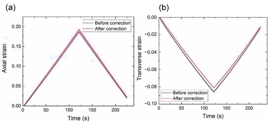 The image quality greatly affects the accuracy of DIC analysis. Unlike those captured with a bilateral telecentric lens, a photo captured by a normal lens is sensitive to the out-of-plane motion of the test specimen. When the specimen moves away from its initial position, the image of the specimen becomes smaller. As a result, DIC may produce an erroneous negative strain. When subjected to an axial tension in the y direction, the specimen contracts in the x and z directions if the material has a positive Poisson’s ratio. The out-of-plane motion is caused by the contraction in the z direction (away from the camera). Other inevitable measurement imperfections, including camera tilt and lens distortion, may also cause out-of-plane motion. For example, Figure 2 shows that at a stretch ratio of 118%, DIC gave non-zero strains on the undeformed ROC surface due to out-of-plane motion; these erroneous strains were of magnitudes of approximately −0.8% and −0.5% in the axial and transverse directions, respectively. These values may appear small compared to the stretch, but in the following section we show that they significantly affected the accuracy of the Poisson’s ratio calculation. Figure 3 shows that axial and transverse strains versus time before and after the correction for the first cycle. Without the correction, both strains were smaller than the actual values due to the out-of-plane motion. A comparison of the equilibrium stress-strain curves also showed a considerable discrepancy between the uncorrected and the corrected cases (Figure 4). Thus, compensation of such errors, particularly in large deformations, is necessary for accurate measurements using 2D-DIC [24,25].