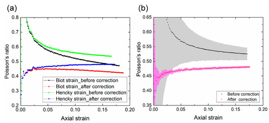 (a) Comparison of the Poisson’s ratios determined by Biot and Hencky strains before and after the correction for the first loading. (b) Means and standard deviations of the Poisson’s ratio (Hencky form). The results are based on six samples at a loading rate of 10 mm/min.
