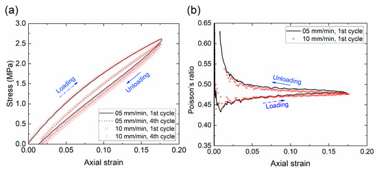 (a) The equilibrium stress-strain curves at the first and fourth cycles at loading rates of 5 mm/min and 10 mm/min. (b) Effect of the loading rate on the Poisson’s ratio (Hencky form) at the first cycle.