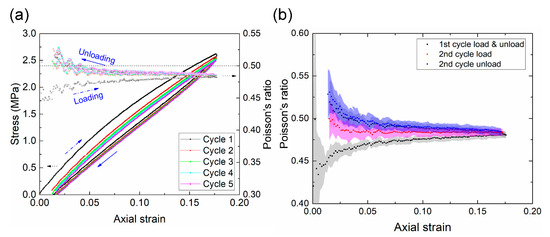 To investigate the changes of the Poisson’s ratio in more detail, we plotted the means and standard deviations of the Poisson’s ratios of six samples at the first two cycles (Figure 7b). We highlight three key observations. First, the standard deviation was generally small (e.g., ≈0.005 at a strain of 10%), indicating that the DIC and RSC method is robust and repeatable. However, it was very large at small strains (e.g., <1%) due to low signal-to-noise ratios. Thus, the data in the small strain regime are not reliable. Second, similar to the equilibrium stress-strain curve, a clear hysteresis loop of the Poisson’s ratio was present in the first cycle, as observed in Figure 7a. The Poisson’s ratio started at a relatively low value of 0.45, and gradually increased with the strain until reaching a relatively high value of 0.48 at the maximum strain (≈17.5%). It remained at a high value during the unloading process. Third, the degree of hysteresis decreased in the second cycle; the Poisson’s ratio during loading was also smaller than that during unloading.