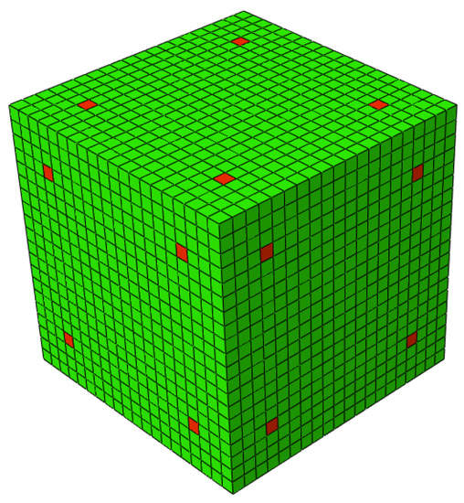 Finite element software Abaqus CAE (Dassault Systèmes, Simulia Corp, Providence, RI, USA) was used to model the cell. This choice was because the TO procedure implemented in a Python script was dependent on an external finite element software. An initial design domain (cubic RUC) is discretized in 20 × 20 × 20 (8000 elements) and 9261 nodes using eight-node brick elements (Abaqus C3D8R, linear brick element with reduced integration) (Figure 2). The CRU discretization (i.e., number of elements) and shape brick element type were selected to reduce computational costs. In order to avoid singularities in FEM problem, when solving equilibrium equations in an entire design space, a minimum density lower bound is imposed () through the parametrization of two materials (i.e., rigid and soft). The properties, Young’s modulus, and Poisson’s ratio, of the two phases (i.e., materials) constituting the RUC were defined in Table 1. The Young’s modulus (E) and Poisson’s ratio () were obtained through experimental mechanical tests. Density 1 was imposed on four elements on each side of the RUC (Figure 2).