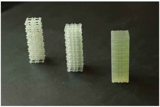 After the TO procedure, the number of solid elements of the RUC mesh was extracted from the .cae file (Abaqus) and recorded in .csv files, having subsequently been imported by a Python script to generate the .stl file of the RUC assembly. The RUCs were modeled with the unit dimensions 10 × 10 × 10 mm3 (Voxel 500 × 500 × 500 μm3) and assembled in a 2 × 2 × 6 arrangement of unit cells (Figure 4 and Figure 5). The graded structures with volume fractions from 0.1 to 0.6 and Young’s modulus of 70.53, 171.43, 280.76, 445.41, 705.33, 919.99 for the maximum bulk case and 25.55, 50.68, 112.56, 281.36, 431.08, 605.14 for maximum shear were assembled in the same arrangement 2 × 2 × 6 unit cells (Figure 6).