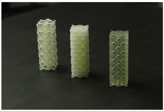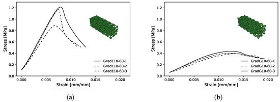 Figure 14a,b show the experimental mean stress–strain diagram for the maximum bulk and shear case graded structures, respectively. In Figure 14a, the stress–strain curves show disparities in the maximum stress values; this may be due to the failure mode described previously (buckling) and its unpredictable nature.