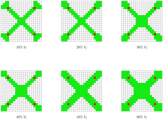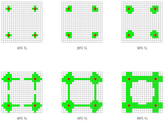 For this case, the number of iterations required to obtain the final topologies varied between 40 and 51 for and 60, respectively (Table 3 and Figure A4b). Similar to the previous case (Bulk), the initial inclusions served with nucleus elements. However, in this case, the regions of the solid elements are united for all the volume fractions. Furthermore, it is in the central region of the RUC that there is a more pronounced evolution in the number of solid elements with the increase in (Figure 11). This may indicate that the proposed method, despite restricting the design domain, does not overlap excessively (i.e., does not dominate over TO) in the distribution of rigid elements in areas with higher sensitivities. The ratio presents higher values for all volume fractions compared to the bulk case. However, this difference decreases with the increase in . Furthermore, the evolution of to 40 has a negative value, compared to the previous value of 30 (Table 3 and Figure 8b).