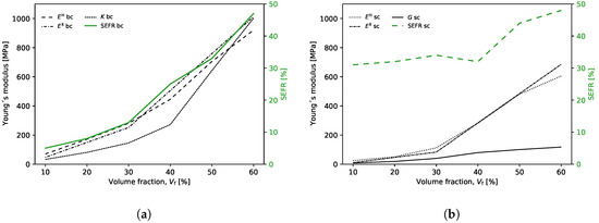 RUC’s homogenized Young’s modulus, bulk modulus, shear modulus and SEFR variation with volume fraction Vf: (a) hydrostatic case; (b) shear case.