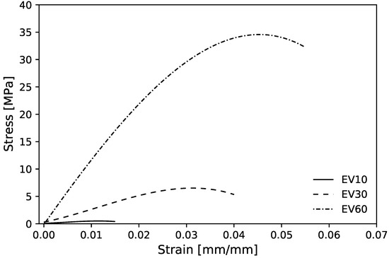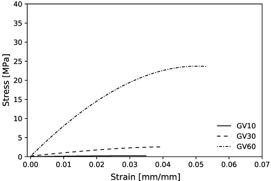 Figure 9 shows the experimental mean stress–strain diagram for the maximum bulk case for the three volume fractions. These curves have characteristics of a semi-rigid polymer with an elastic region, however, without showing a well-defined transition to plastic deformation region, typically observed on VeroClear Polyjet material [51,81,82].
