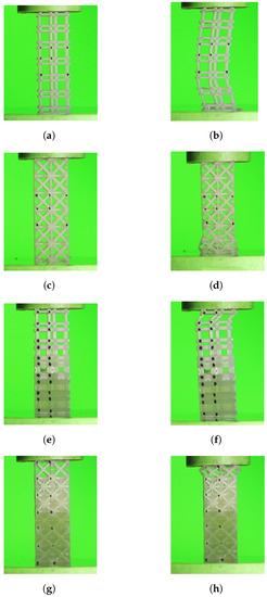 Compression test failure modes; (a) test sample for maximum bulk with 10% Vf not deformed; (b) test sample for maximum bulk with 10% Vf after a compression test, showing mechanical instability (buckling); (c) test sample for maximum shear with 10% Vf not deformed; (d) test sample for maximum shear with 10% Vf after a compression test, showing mechanical instability in lower test plate contact RUCs; (e) test sample gradient for maximum bulk with 10–60% Vf not deformed; (f) test sample gradient for maximum bulk with 10–60% Vf after a compression test, showing mechanical instability (buckling) in top test plate contact RUCs (10% Vf); (g) test sample gradient for maximum shear with 10–60% Vf not deformed; (h) test sample gradient for maximum shear with 10–60% Vf after a compression test, showing mechanical instability in top test plate contact RUCs.