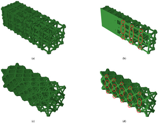 The predicted total Young’s modulus () of the bulk and shear graded structure showed values of 141.24 and 53.13 MPa, respectively. The experimental mean values of compressive Young’s modulus () of graded structures reached values of 151.80 and 37.70 MPa with standard deviation (S) of 10.88 and 3.57 MPa, for the bulk and shear case, respectively. The experimental mean values of compressive Young’s moduli () of graded structures were compared with predicted total Young’s moduli () computed with Equation (2). For the bulk and shear graded structures, the errors were 6.96 and , respectively. The failure modes for both graded structures occurred in the lowest volume fraction RUC and are similar to those observed for corresponding single RUCs. Figure 10f,h shows maximum bulk and shear grade structures, respectively after testing. The failure occurred due to buckling and not deformable cones for the bulk and shear case, respectively. Figure 13a–d show the graded sample tests solid model and the interface between unit cells with different volume fractions, for the maximum bulk and shear case, respectively. In Figure 13b,d, the connection zones between adjacent RUCs show that connectivity is maintained, which enables the kinematic connection through the entire graded structure.