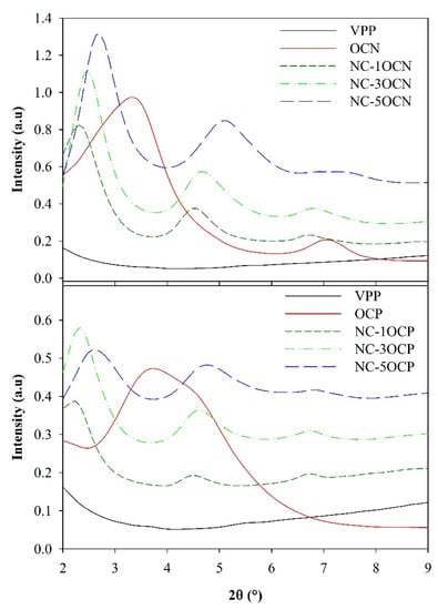 On the other hand, the diffractogram of pure OCP presented the characteristic peak of this clay at 3.68° (Figure 1). Meanwhile, nanocomposites NC-OCP presented three peaks, the one at lower angles associated with an increase of the interlayer distance (peak c) and the other two peaks related to the reduction of the interlaminar distance (peaks d and e), resulting in combined intercalated/tactoid structures (Table 1).