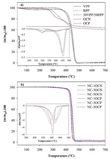On the other hand, the incorporation of nanoclays into the VPP/RPP blend improved its thermal stability shifting onset decomposition at higher Tonset values, with a less significant effect on nanocomposites with OCP. These results agreed with (i) the lower Tonset for pure OCP (267.2 °C) compared to OCN (296.4 °C), indicating that earlier degradation of the organic modifier of OCP accelerated the decomposition of the nanocomposite, and (ii) the organic surfactant of pure OCP degraded with a maximum rate at a lower temperature (299 °C) than OCN (327 °C) (Table 3). Both organic modifiers degraded in two stages according to the confinement of the surfactant between clay mineral layers, as is shown in Figure 2. These phenomena are observed during TGA analysis of the films and clays but it is worth mentioning that extrusion temperature for obtaining films (180–190 °C) was far below Tonset of the pure clays.