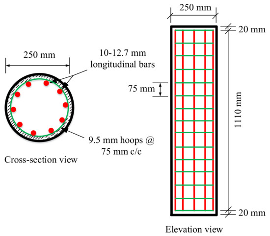 In the current study, a total of nine circular GGRAC compressive members were fabricated and tested to examine the effect of different GFRP bars and vertical pitch of GFRP ties on the structural performance of compressive members. The diameter of the compressive members was 250 mm and the height of compressive members was 1150 mm, making them small enough to fit in the available compression machine and large enough to be considered as full-size compressive members. Three groups of compressive members were manufactured. Each group consisted of three compressive members with six, eight, and ten GFRP bars of 12.7 mm diameter, respectively. In the first, second, and third compressive members of each group, the spacing of GFRP hoops (9.5 mm thick) was 75 mm, 150 mm, and 250 mm, respectively. The longitudinal GFRP reinforcement ratios in the first, second, and third groups were 1.57%, 2.11%, and 2.65%, respectively. These low reinforcement ratios could be preferred in low seismicity zones [22,23]. The slenderness ratios of all specimens were kept at 4.6, defining them as short columns. Furthermore, the diameters of reinforcing bars were chosen by keeping the size of compressive members and axial compression capacity of the laboratory instrument in mind. The volumetric ratios of transverse GFRP hoops were 1.42%, 0.71%, and 0.50% for the first, second, and third compressive members of each group, respectively. The spacing of transverse GFRP hoops was adjusted so that the elastic buckling of GFRP bars could be ensured [36]. The concrete cover was kept at 20 mm for all test compressive members. The geometric and cross-sectional specifications of a specimen with 10 GFRP bars and 75 mm transverse GFRP hoop spacing are presented in Figure 3.