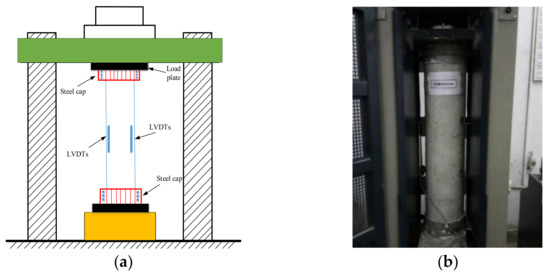 Testing of compressive members in the present study: (a) schematic diagram (b) experimental setup.