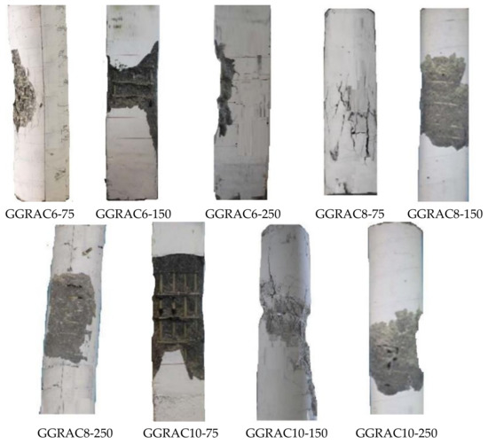 The failure of all the GGRAC compressive members occurred in the middle region due to the buckling of the main GFRP bars and the breaking of lateral GFRP ties. After the application of the axial compressive load, the compressive members behaved elastically up to about 85% of the peak load. At this point, the confining influence given by the transverse GFRP ties was not triggered. When the compressive load was increased more, the GRAC initiated cracking, having a vertical hairline crack and a low sound in the compressive members. After gradually increasing the load up to the peak value, the cracks extended along the length of compressive members, and the width of cracks was amplified. The cracking of the concrete cover started and GFRP ties were activated to deliver lateral confinement to the core. Finally, the test compressive members consecutively showed the fracture of GFRP hoops at about 65% of the maximum amount in the post-peak behavior; breakage of main GFRP bars; and finally, the crushing of GRAC core restricted with lateral GFRP hoops. Figure 5 represents the experimental crack initiation and propagation.
