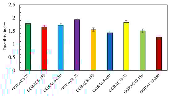 Ductility is the capacity of the structural elements to absorb energy. For GGRAC compressive members, the ductility index was calculated as the ratio of the area under the load–deflection curve up to 85% of peak load in the post-collapse behavior to the area under the load–deflection behavior up to 75% of peak load in the pre-peak loading, as evidenced by the previous studies [41,42,43]. Figure 6 presents the ductility indices for all GGRAC compressive members. The compressive members with a smaller spacing of stirrups showed higher ductility indices. The compressive members GGRAC6-75, GGRAC8-75, and GGRAC10-75 showed ductility indices of 1.78, 1.93, and 1.83, respectively.