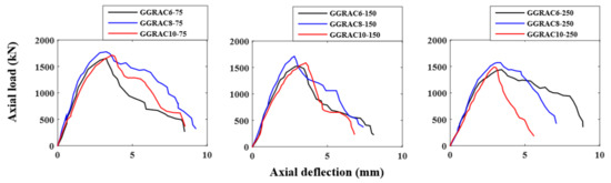 The experimental results for the peak LCC, the deflections at the peak LCC, and the ultimate deflections of GGRAC compressive members were reported in Table 5. The maximum LCC was given by the specimen GGRAC8-75, having a value of 1777.3 kN that was 7% higher than the specimen GGRAC6-75. The highest ductility index was also presented by the specimen GGRAC8-75 due to its higher energy absorption and higher stiffness in the post-peak loading stage. Column GGRAC8-75 initially had a linear rising slope that was up to an axial load of 1758.6 kN and axial deformation of 2.83 mm. After that, a slight nonlinear climbing part seemed to be due to crack propagation, ending with a peak axial LCC of 1777.3 kN at 3.25 mm.