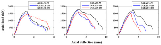 Figure 7 portrays the influence of longitudinal reinforcement ratio on the complete load–deflection performance of GGRAC compressive members. No significant improvements in the axial LCC of compressive members were observed by increasing the longitudinal reinforcement ratio except making the compressive members more brittle. By enhancing the number of bars from six (1.57% reinforcement ratio) to eight bars (2.11% reinforcement ratio) and ten bars (reinforcement ratio of 2.65%), the improvements in the axial LCC of GGRAC compressive members with 75 mm spacing of hoops were 7% and 3.5%. By increasing the reinforcement ratio from 1.57% to 2.11% and 2.65%, the improvements in the axial LCC of GGRAC compressive members with 150 mm stirrup spacing were 11.2% and 4.2%. Similarly, by increasing the reinforcement ratio from 1.57% to 2.11% and 2.65%, the improvements in the axial LCC of GGRAC compressive members with 250 mm stirrup spacing were 8.3% and 3.2%. Therefore, high longitudinal reinforcement ratios did not present a significant increase in axial capacity. However, the compressive members with a larger number of GFRP bars presented a higher axial stiffness response due to a larger effectiveness ratio of axial stiffness of GFRP bars to the effective GRAC cross-sectional area.
