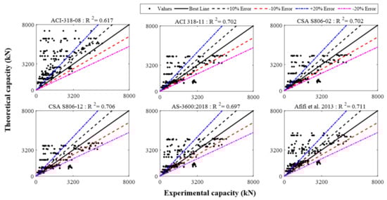 Here, n shows the total number of the sample points, x is the LCC of GFRP-RC compressive members attained from experiments, and y is the value of LCC of GFRP-RC compressive members given by the mathematical models. Figure 9 shows the assessment of all empirical models.