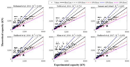 The database developed for GFRP-RC compressive members was employed to assess the different empirical models that were taken from the previous research to acquire a general form of the recently proposed model for axial LCC [25,28,44,45,46,47,48,49,50,51,52,53]. These models were assessed by using some statistical indices, coefficient of determination (R2), the mean absolute error (MAE), and the root mean squared error (RMSE), as reported by Equations (1)–(3), respectively. Of all the statistical parameters, R2 is the most crucial and the most appropriate. Therefore, the experimental results were utilized for performing the comparative study using this parameter.
