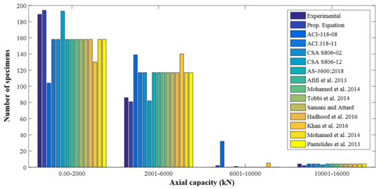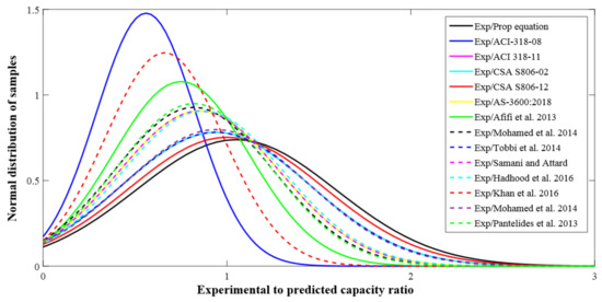The distribution for the previous predictions, as well as the testing measurements for the axial strength of GFRP-RC compressive members, is reported in Figure 11. The database constructed had a total of 185 different test values for axial LCC ranging from 0–2000 kN. In this range, 165 values were provided by the proposed equation. Similarly, there were 86 experimental and 81 estimated values in the 2001–6000 kN range, 0 experimental and 2 estimated values in the 6001–10,000 kN range, and 4 experimental and 2 predicted values in the 10,001–16,000 kN range. These values go on to show that the equation put forward did a good job of describing the axial LCC of GFRP-RC compressive members. Figure 12 shows the normally distributed experimental and estimated values for the axial strengths of GFRP-RC compressive members. The data of this graph were attained from the normalized estimates of different previous equations over the constructed database. With a variation of only 4% from unity, the suggested equation has done well for the normalized values of ratios of experimental axial LCC to estimated LCC; 41% was the peak deviation for ACI-318-08 [45]. The deviation may owe to the intention that the recommended model by ACI-318-08 [45] is for conventional steel reinforcement but this model is employed only for relative study. Additionally, the fractional deviations for the equations given by Khan et al. [52], Afifi et al. [25], and CSA S806-12 [44] were 29%, 20%, and 7%, respectively.