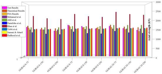 The comparative investigation depicted that the proposed model described the LCC of GRAC compressive members with high accuracy, as reported in Figure 13. The newly proposed mathematical model for the LCC of compressive members portrayed an average error of 5.18% for GGRAC compressive members. The previous models reported higher deviations for the axial LCC of GGRAC compressive members. Thus, the predictions of the proposed empirical models solidly substantiate its applicability and accuracy for satisfactorily capturing the LCC of GGRAC compressive members by bearing in mind the involvement of GFRP longitudinal and transverse bars. The proposed structural element is a feasible member in terms of cost, material availability, and environmental sustainability factor [58,59,60].