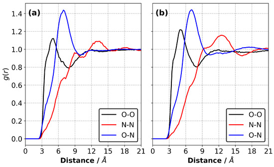 Radial distribution functions (RDFs) between the monomers (the reactive oxygen atom was chosen as a representative atomic site) and anions (the nitrogen atom of the TfN was chosen as a representative atomic site) in the liquid (a) CEIL-2 and (b) CEIL-3 systems at 227 C.