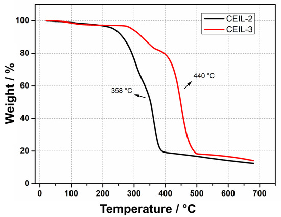 The thermal stability of both ILs was assessed by thermogravimetric analysis (TGA) (Figure 4). The results revealed outstanding thermal stability for the two monomers, evidenced by minimal weight loss at about 290 C followed by thermal degradation at 358 and 440 C for CEIL-2 and CEIL-3, respectively. The elevated degradation temperatures support our previous works and further confirm the high thermal stabilities of imidazolium-based ILs bearing TfN as counter-ion. Not surprisingly, CEIL-3 presented greater thermal stability, probably due to the higher physicochemical stability of ether groups compared to esters (see Figure 4) [20,42].