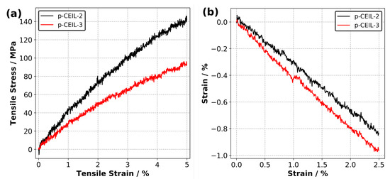 (a) Predicted tensile stress versus tensile strain plots and (b) strain versus strain plots for p-CEIL-2 and p-CEIL-3 obtained at 27 C.