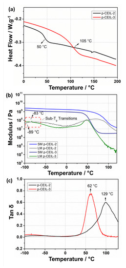 Additionally, the greater distance between the lateral epoxy groups generates cross-links into the p-CEIL-3 networks more widely spaced, which could also increase the mobility of the polymer chains [20]. This additional mobility for the p-CEIL-3 chains is macroscopically observed by a lower T and lower storage modulus values when compared to the p-CEIL-2 network. Interestingly, the resulting DMA graphs display a minor relaxation at −83 and −89 C for p-CEIL-2 and p-CEIL-3 networks, respectively. Such behaviour was already described for different epoxy networks, and it likely originates from the local motion of the moieties such as hydroxyl and diether [47,48].